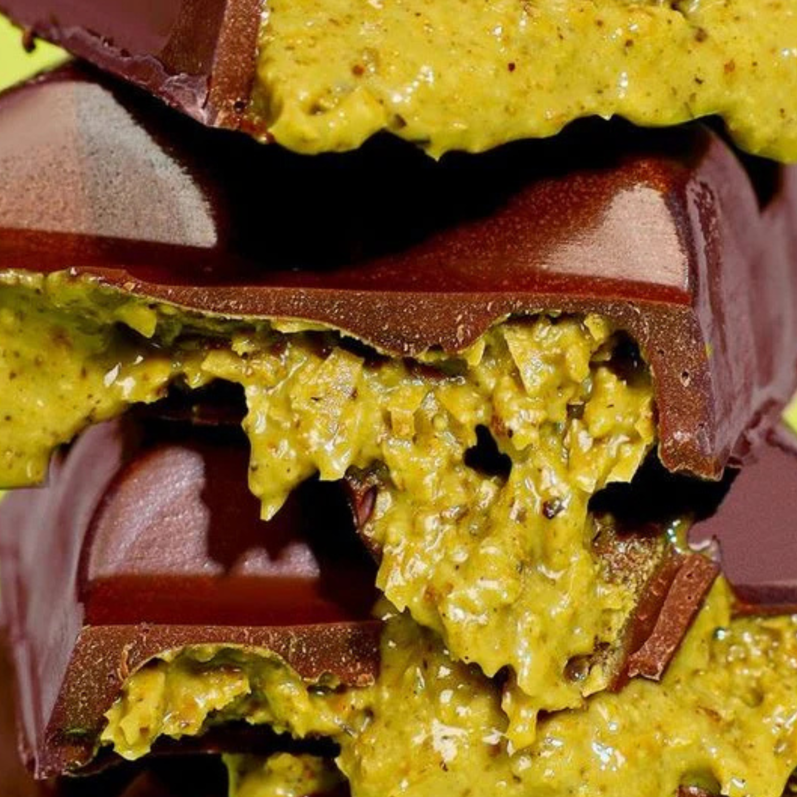 Texture croustillante de kadaifes grillés, cœur fondant de pistache royale, enrobé d’un chocolat au lait velouté
